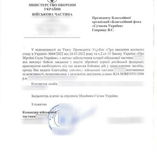 Волонтерська група «Лазерхауз» отримала запит від 23 ОСБ щодо допомоги з придбанням автомобіля для виконання завдань в зоні бойових дій в Донецькій області. Ми придбали позашляховик Kia Sorento та підготувати його: провели повний ТО, пофарбували та придбали болотяну гуму. Волонтерська група «Лазерхауз» вже передала автомобіль нашим Захисникам. Військові надіслали нам офіційну подяку та стяг.